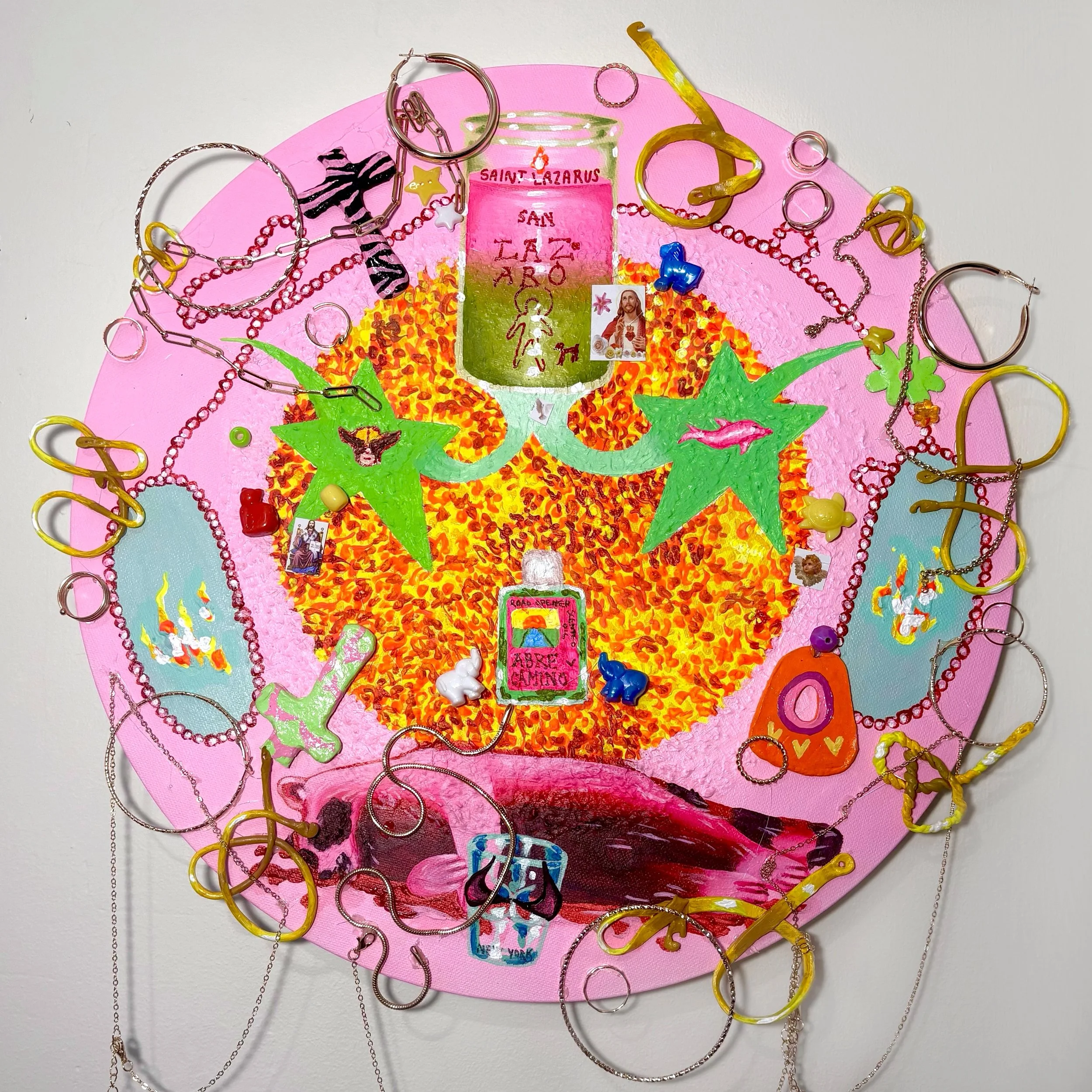 The Inevitable Heat Death of the Universe ✿ 2025 ✿ 16 inches in diameter ✿ Acrylic and found material on canvas